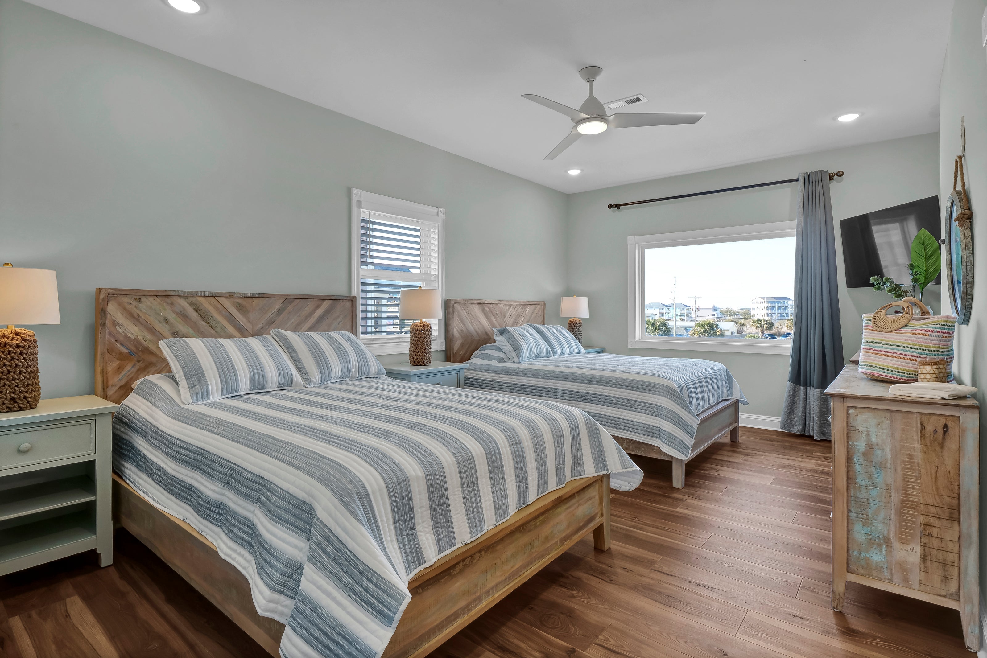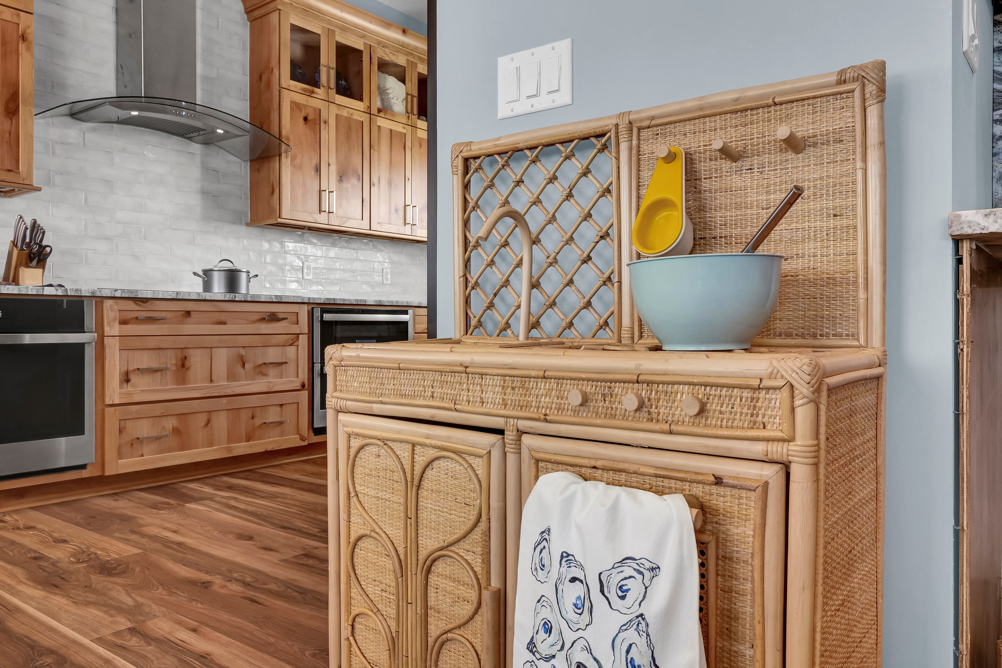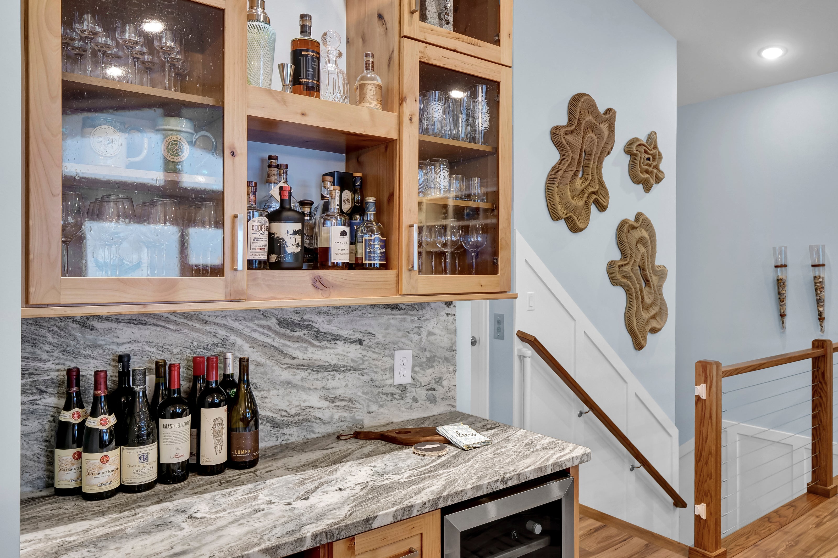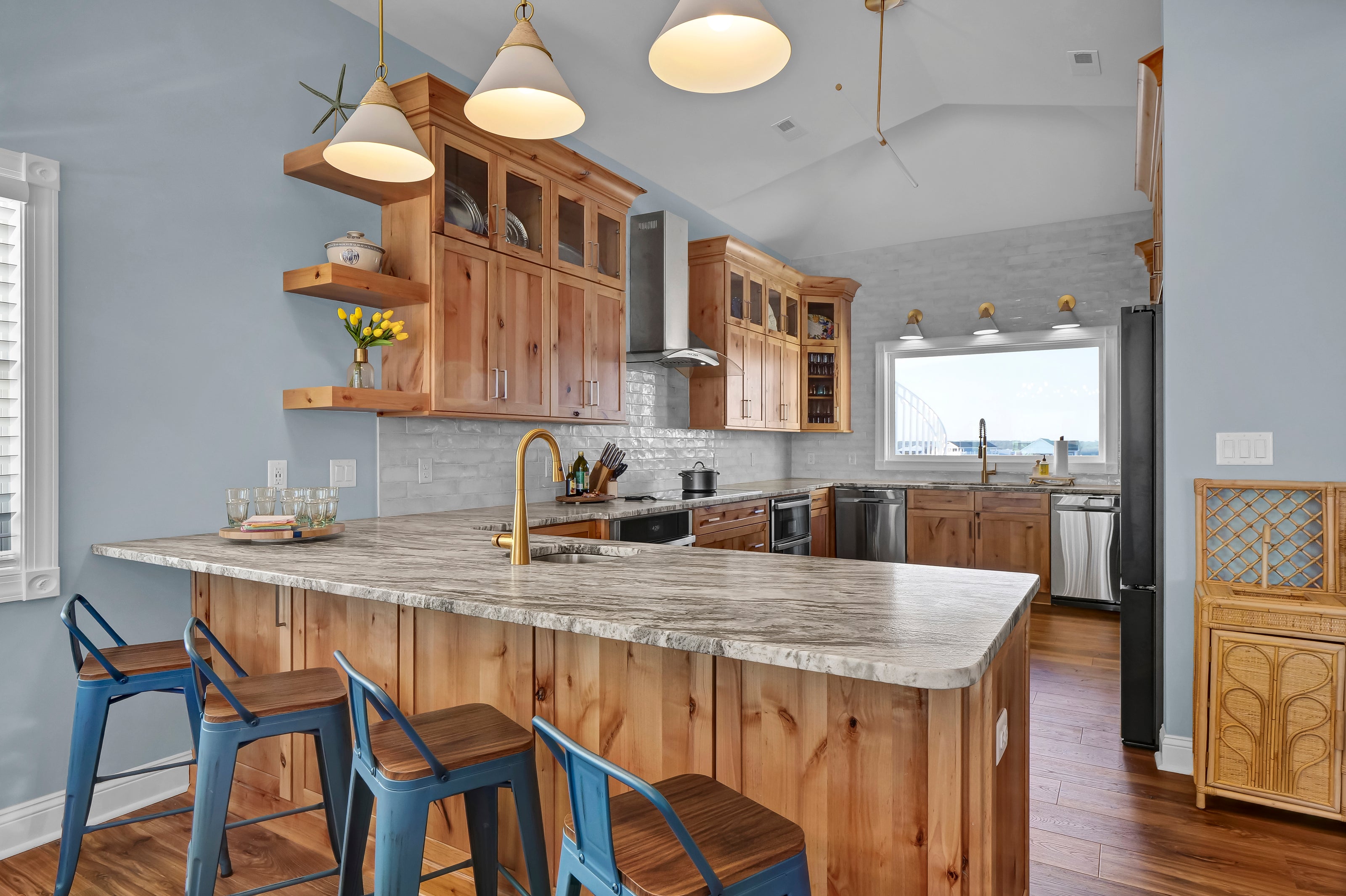 The top floor of The Scotch is adorned with light-filled spaces and sweeping ocean views, serving as a stunning location for the main living area. Here, you can prepare meals in the well-appointed kitchen and gather with loved ones for dinners overlooking the azure waters.