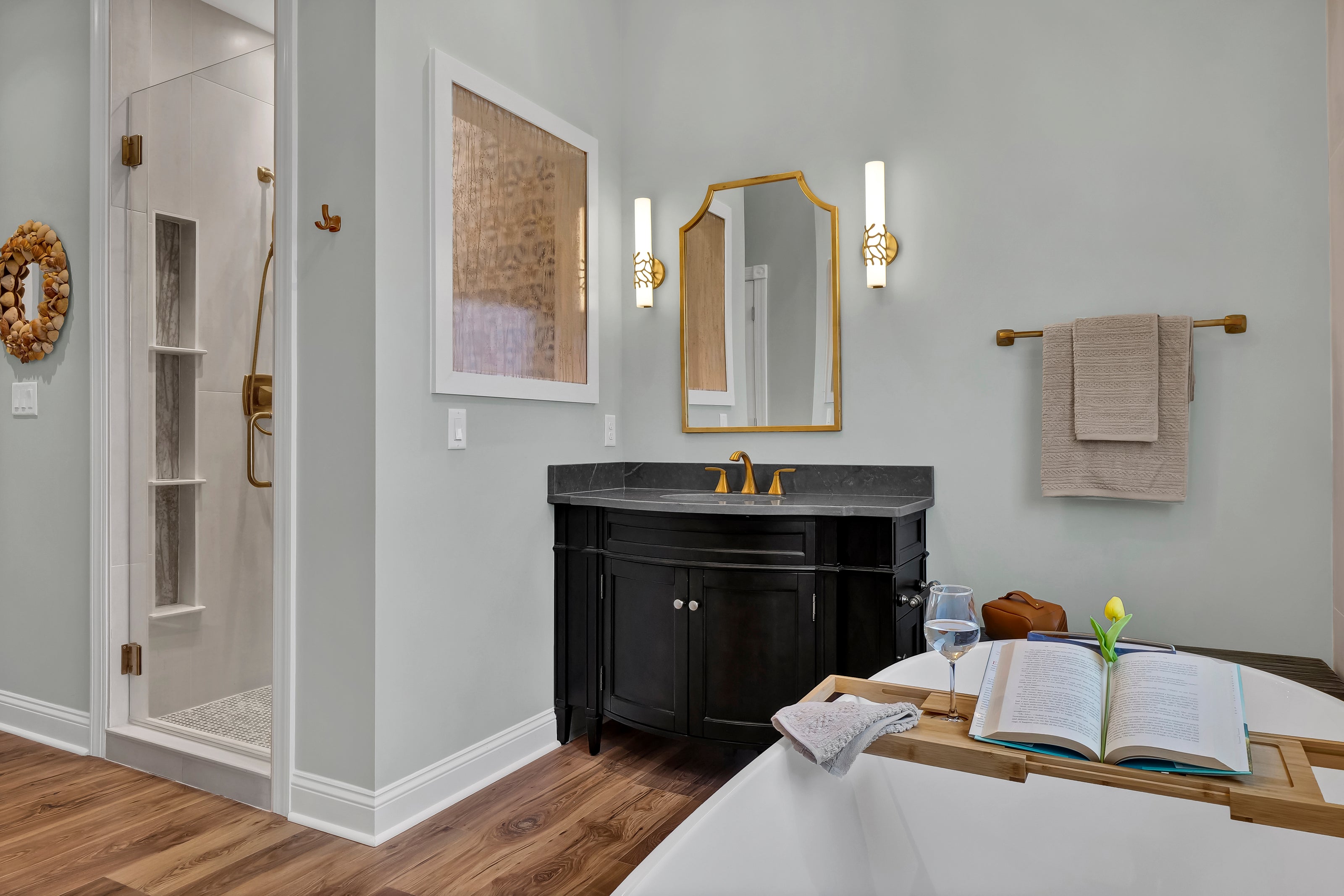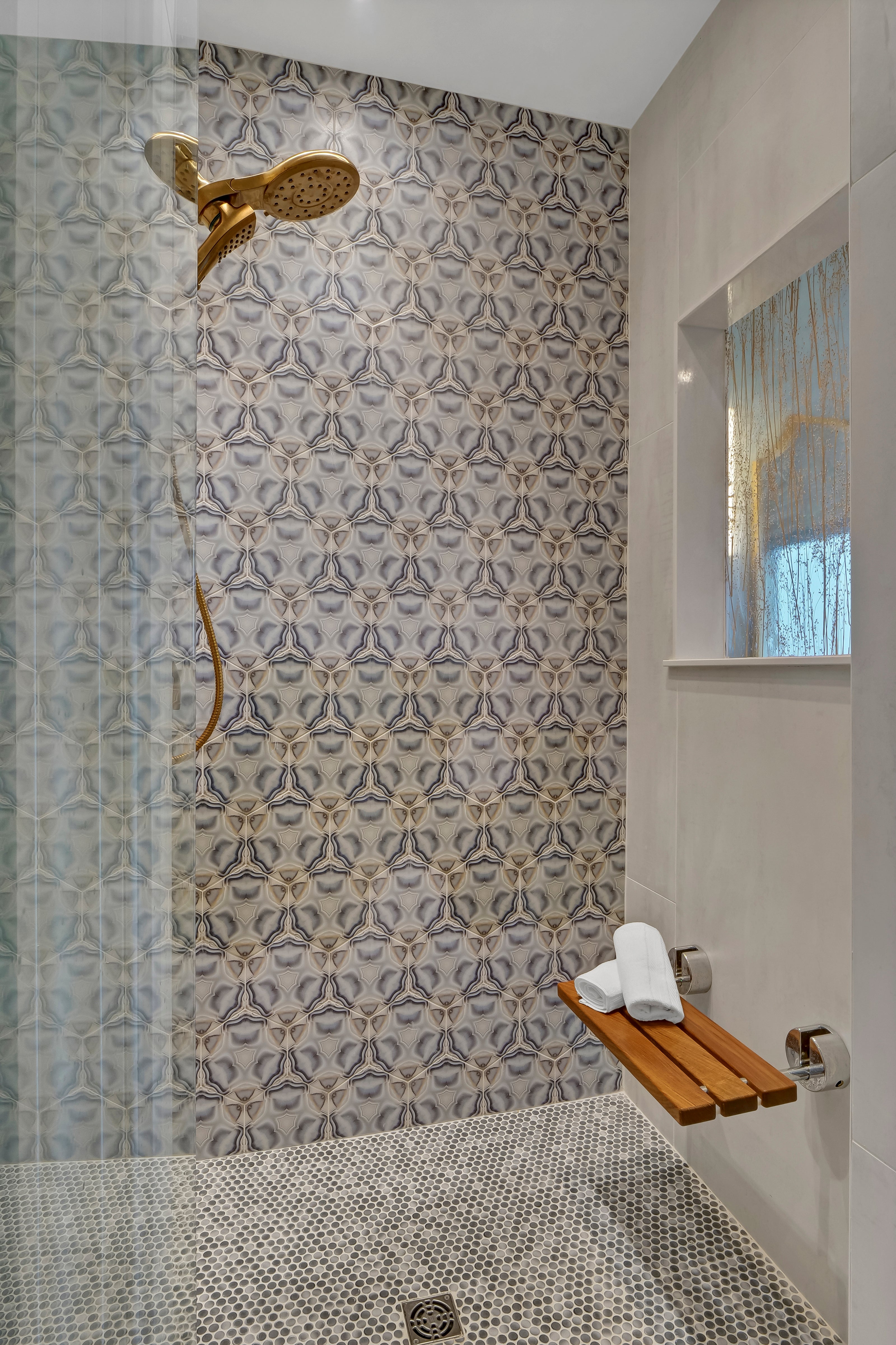 The ensuite continues the coastal feel with warm brass fixtures, a freestanding tub, and double vanities. The shower features accent tile that nods to the turtle theme through organic, nature-inspired patterning. Together, the room and bath form a cohesive, tastefully designed suite that overlooks the ocean and reflects the home’s coastal setting.