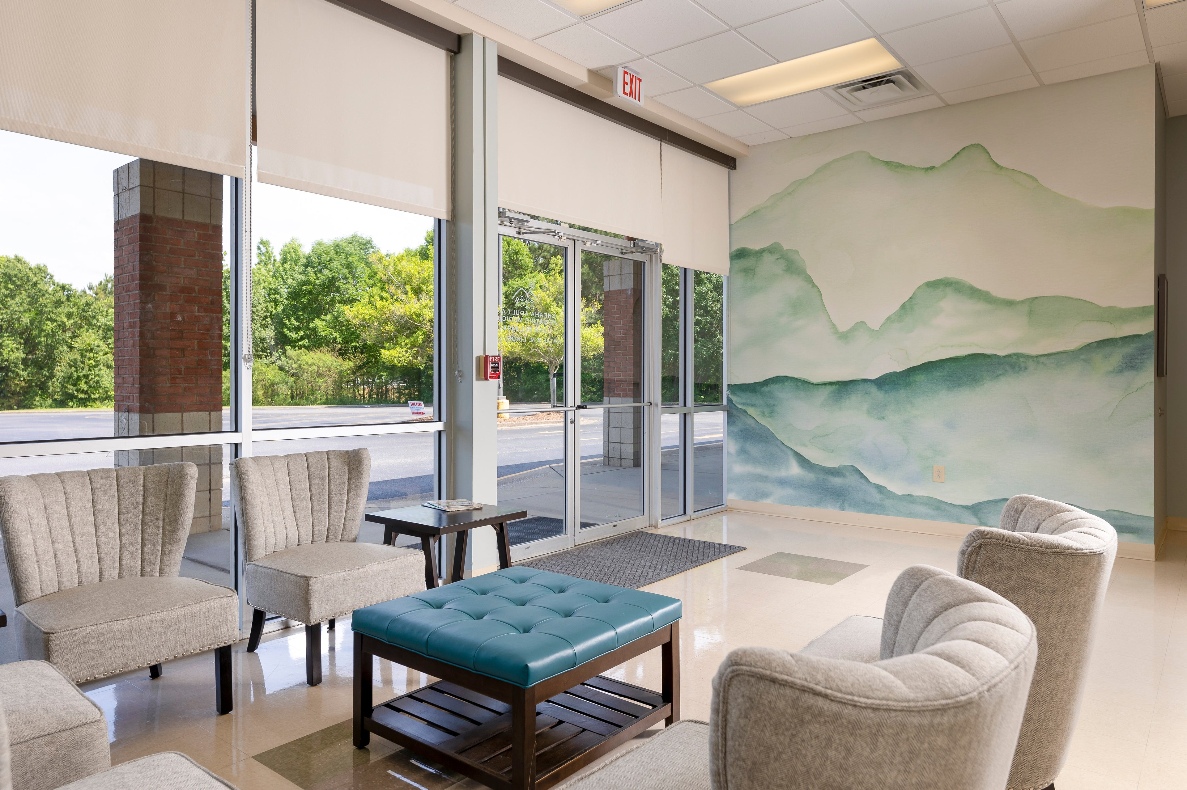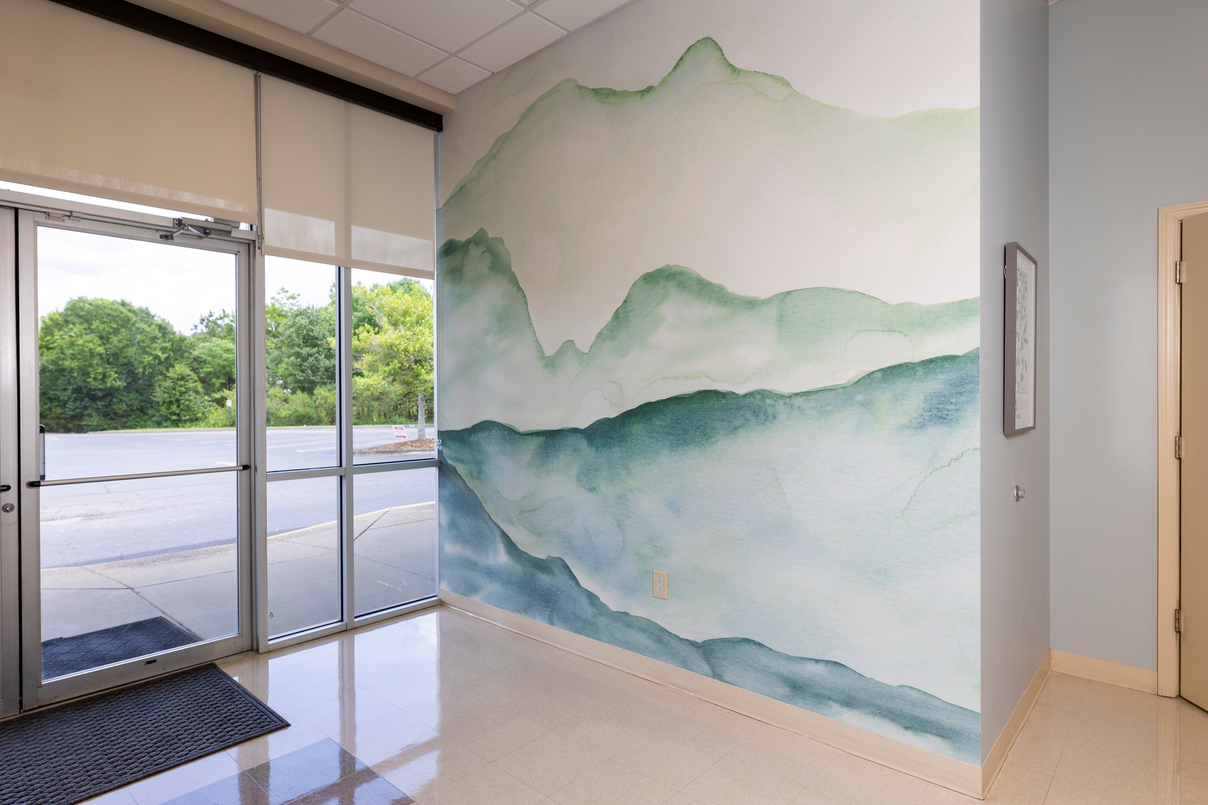 Transforming a former medical office into a vibrant new practice, we retained its solid foundation and elevated the space with personalized touches. The lobby, now a bright and inviting space, centers around a captivating mountain mural, creating a warm focal point. The calming color palette of blues and greens, inspired by a piece of art shared by Dr. Lindell, sets a serene and nature-inspired tone that extends seamlessly throughout the entire space.