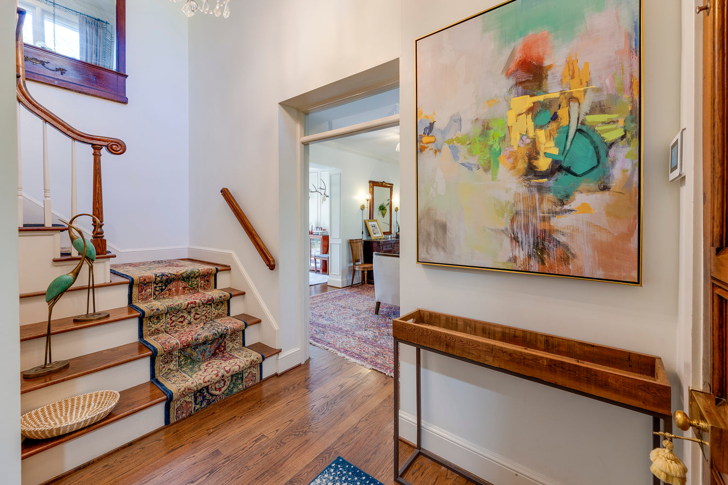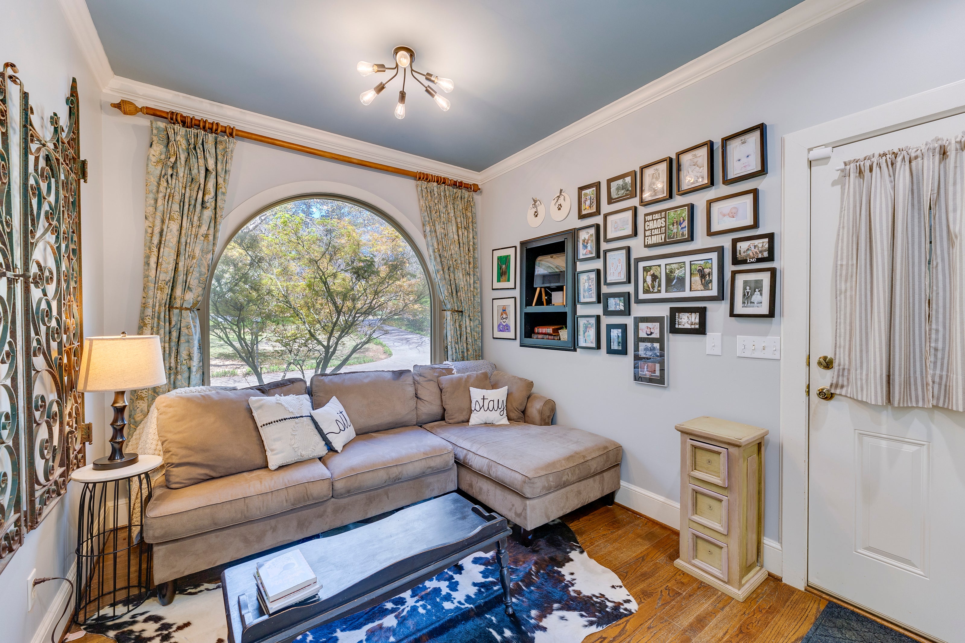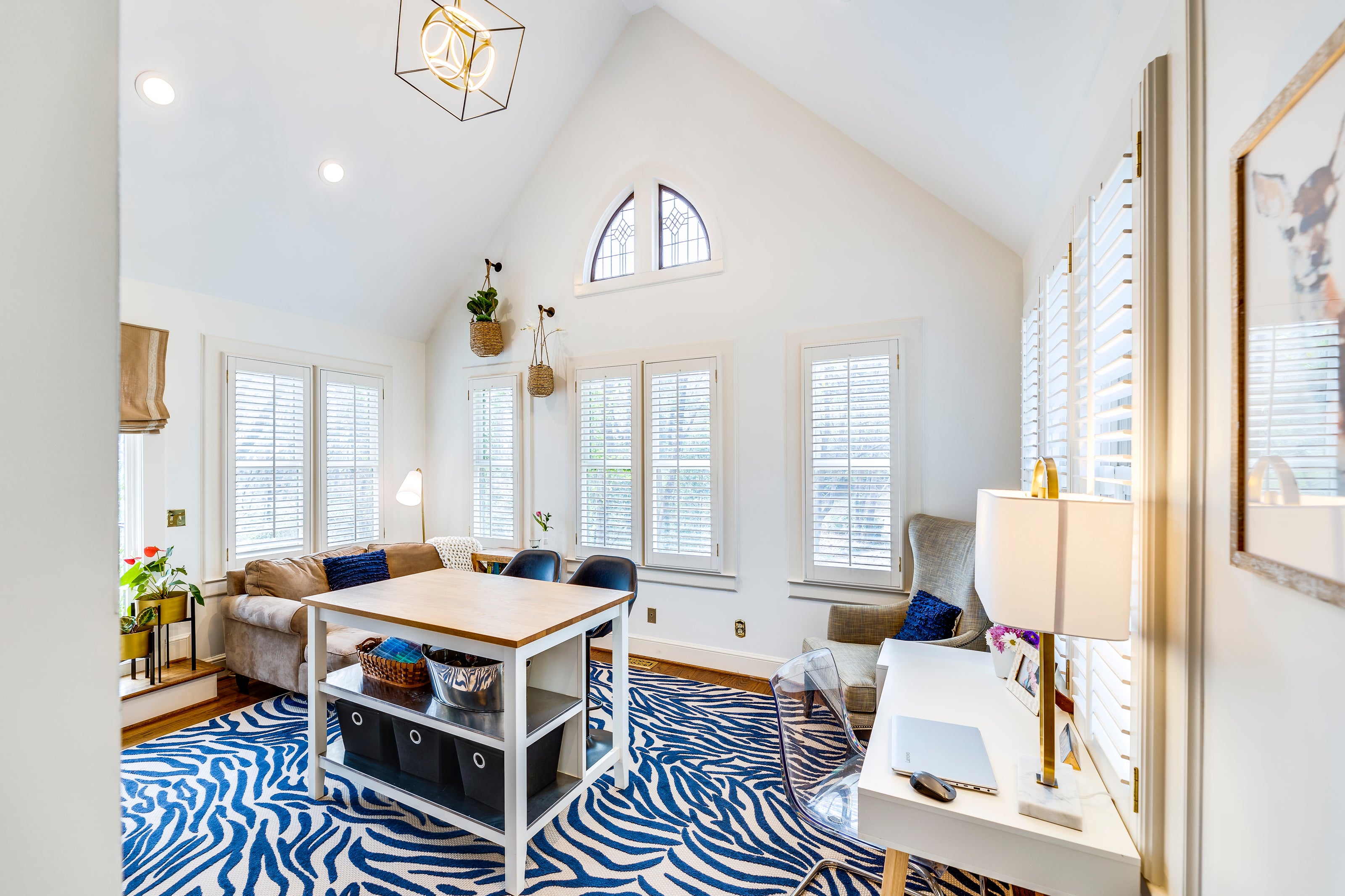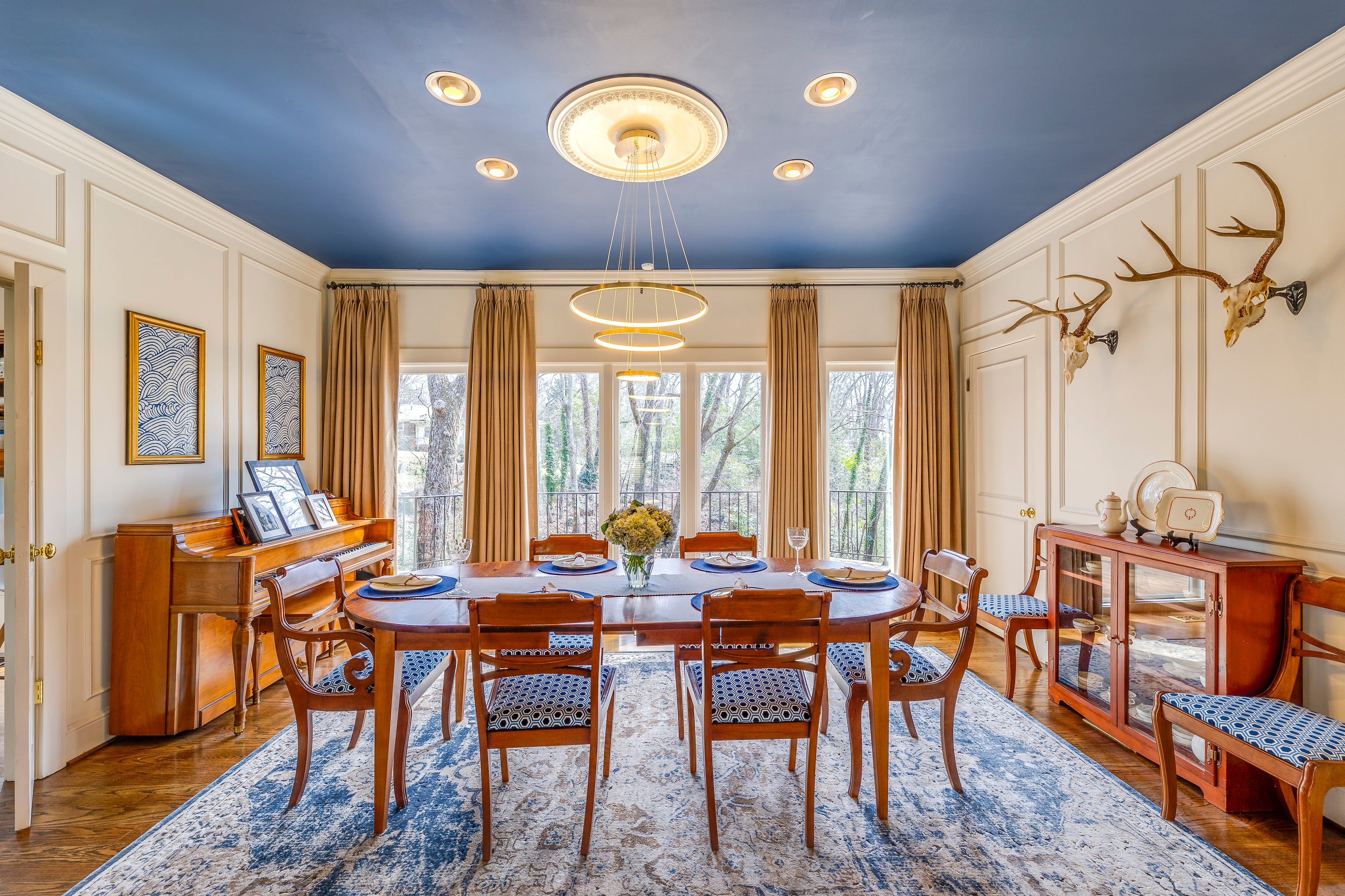 This project focuses on revitalizing the home's living areas. Seamless connectivity between the living and dining rooms is enhanced by a unifying, light wall color, creating an open and inviting ambiance. Large windows in the dining room showcase breathtaking views, complemented by a striking dark ceiling, neutral window panels, and a sleek chandelier that frames the unique scenery. The navy and gold accents in the dining room are thoughtfully woven into various accessories throughout the home.
